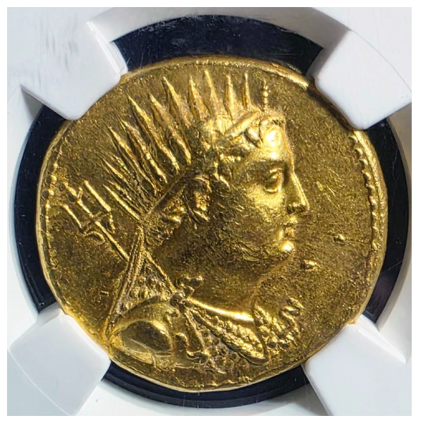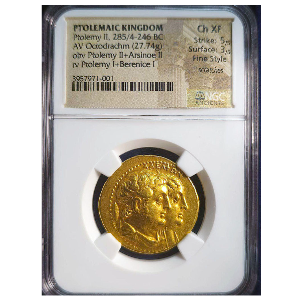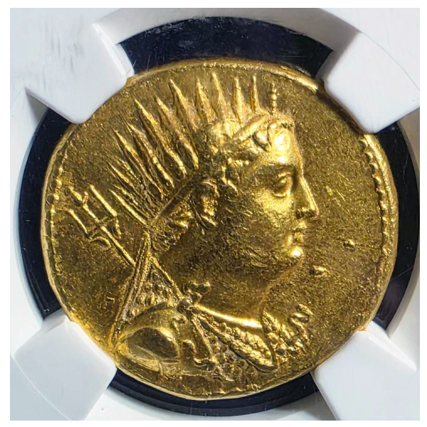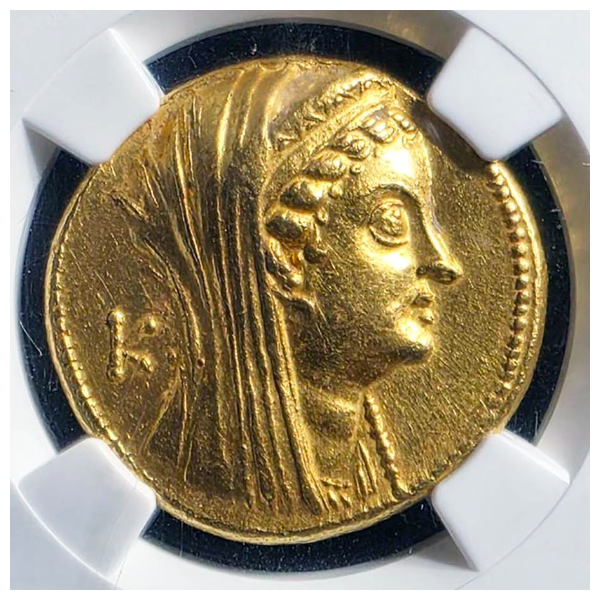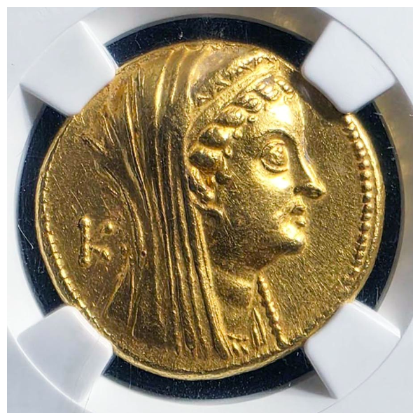 プトレマイオス アルシノエ2世は、非常に人気のコインで、プトレマイオス最後の王クレオパトラを連想させるのかもしれません。それ故程度が良いアルシノエは近年価格の上昇が著しいです。このコインはCh AU 4/5 4/5とグレードが高く、顔の表情も良く、センターマークでダメージ、スレもほとんどない良いコインです。