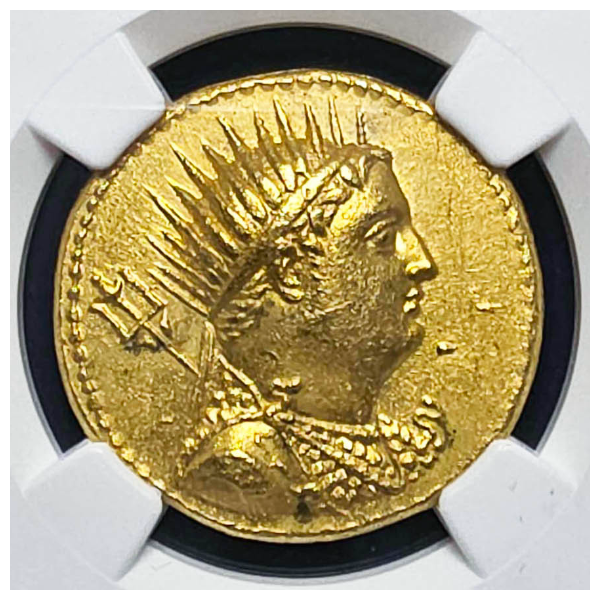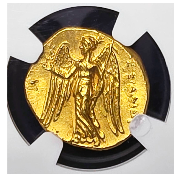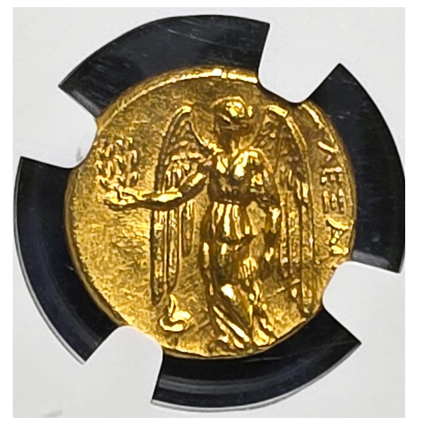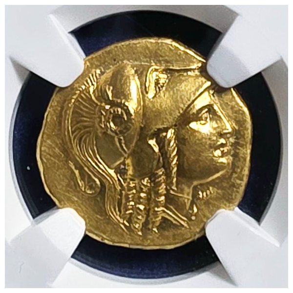 セレウコス1世紀のこのタイプの肖像は、顔が凛としており、ヘルメット飾り、髪の広がりなど全体的な華やかで他のアレキサンダーのスターテル金貨と一線を画いています。出現率も非常に少なく、画角の切れもなく、オススメのコインの1つです。
