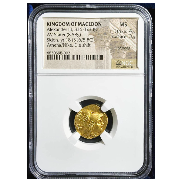 グレードはMSと非常に良く、刻印もしっかりして目の瞳も見え表情豊かであります。このコインの最大の特徴はシドンで作製され、その年もシドン18年、紀元前316年もしくは15年とはっきり分かっており、非常に珍しいコインです。