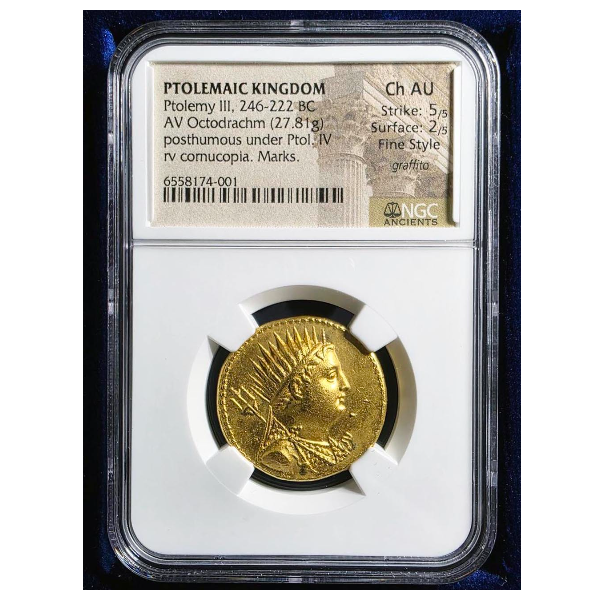 このコインの表面は2/5と若干低いのですが、拡大してみると、表面に軽くスクラッチ状のものが見られますがほとんど肉眼では見られないです。打刻は5/5と最高評価とさらにはファインスタイルと加点が付き、全体的にはCh AUと非常にグレードが高いです。Ch AU以上のプトレマイオス3世コインはほとんど見られません。